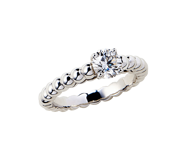 デザインを特徴付ける玉状のアームは、メゾンのさまざまな作品を縁取るゴールドビーズが着想源。やわらかな印象だけでなく、遊びごころもしっかりと薫らせることができる。ソリティアとはいえ、他とはかぶらないデザインもうれしいポイント。ダイヤモンドはラウンドカットで、普遍的な魅力を併せ持つ。